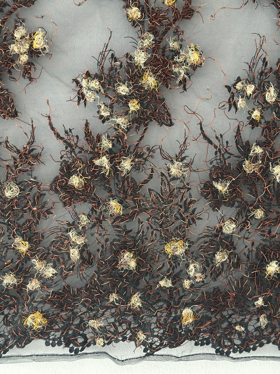 hilos de caraguata costurados de maneramanual sobre sintetico .Los hilos de caraguata fueron producidos y teñidos con tintes naturales elaborados por mujeres Nivacle , Ayoreo y Enlhet.