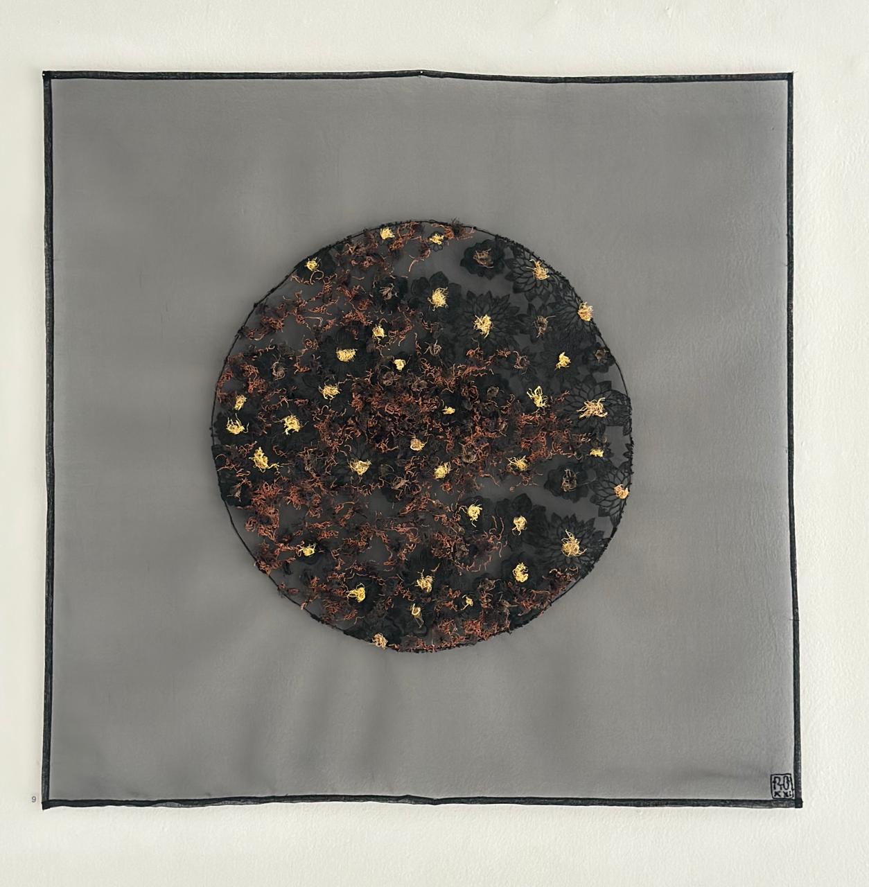 Hilos de caraguata costurados de manera manual sobre sintetico . en el centro se encuentra la palabra APOCALIPSIS .En cuatro hilos de caraguata ,fueron producidos y teñidos con tintes naturales elaborados por mujeres Nivacle y Ayoreo